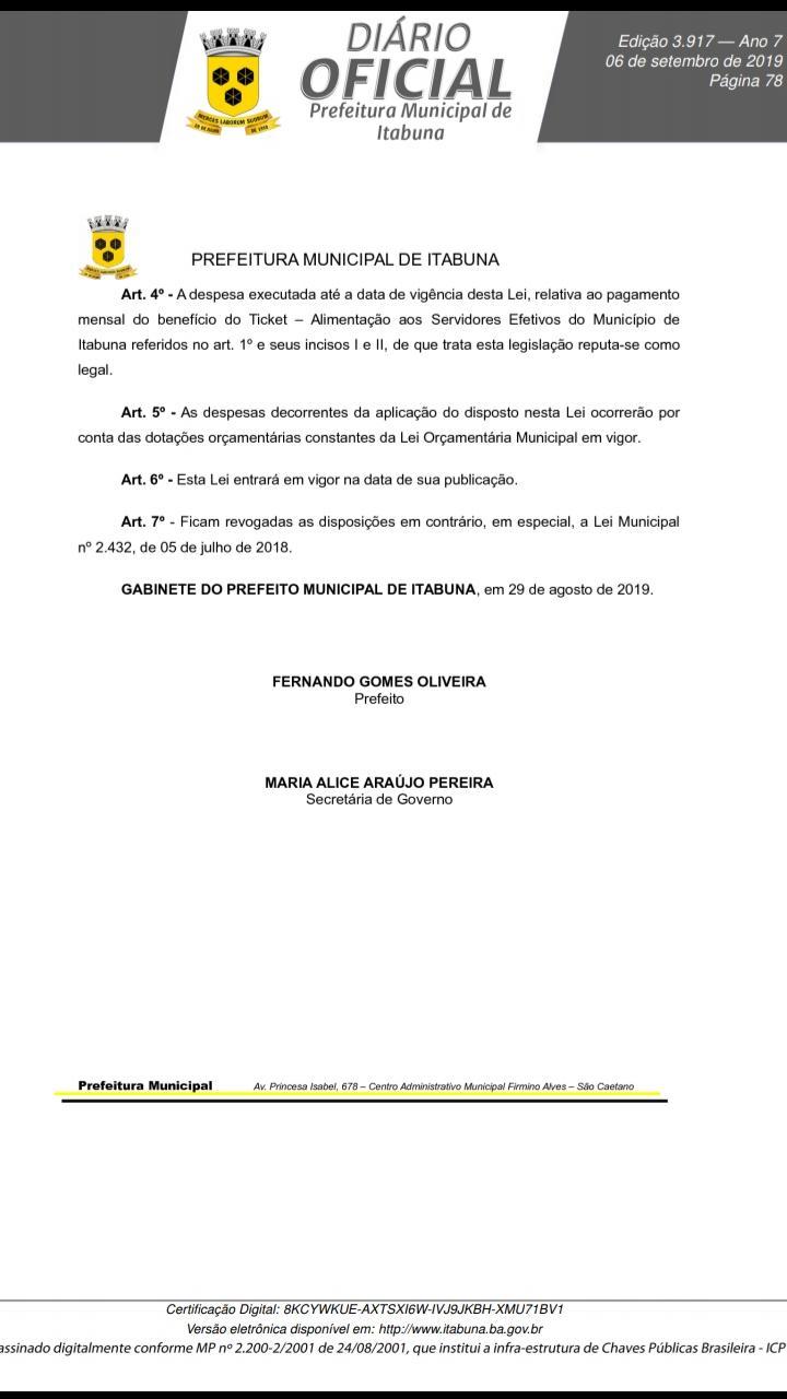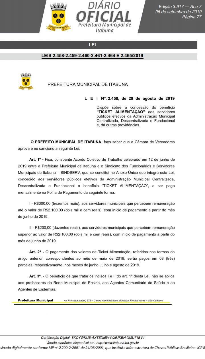 No dia 29 de agosto o prefeito de Itabuna sancionou a lei que garante o benefício do Ticket Alimentação para os servidores e servidoras municipais de Itabuna, efetivos e efetivas, da Administração Municipal Centralizada, Descentralizada, e Funcional.