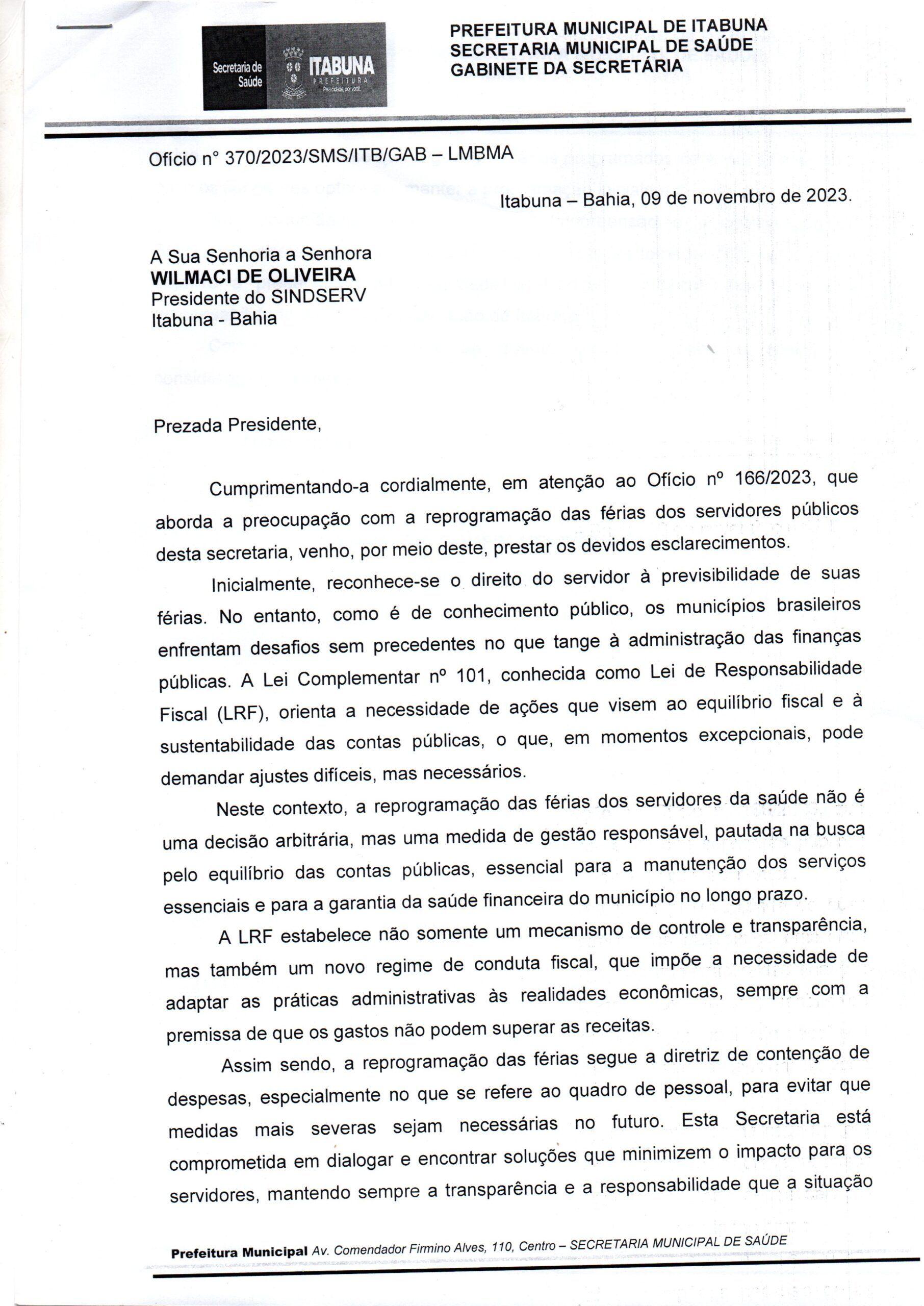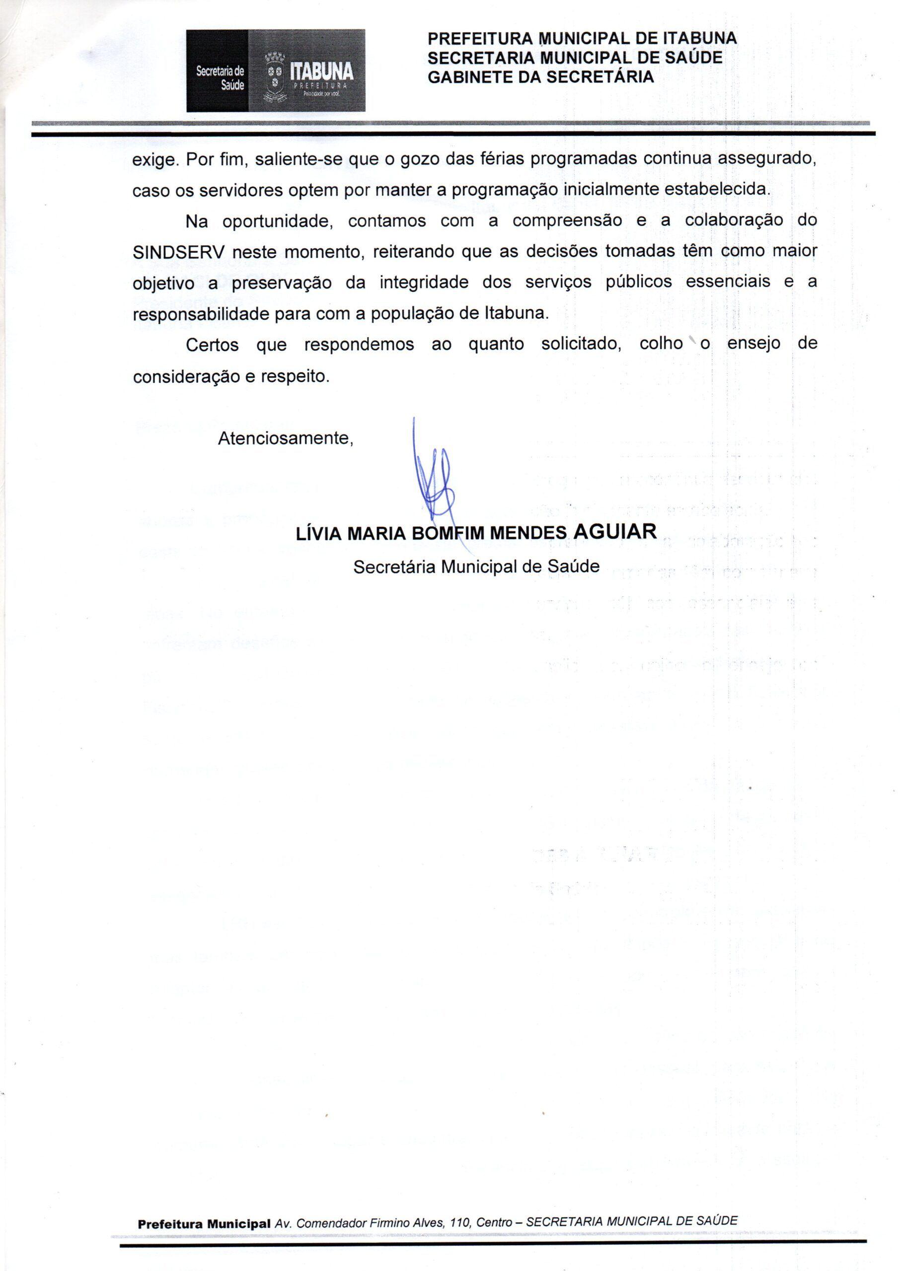 Segue abaixo o ofício da Secretaria de Saúde em resposta à solicitação do Sindserv: